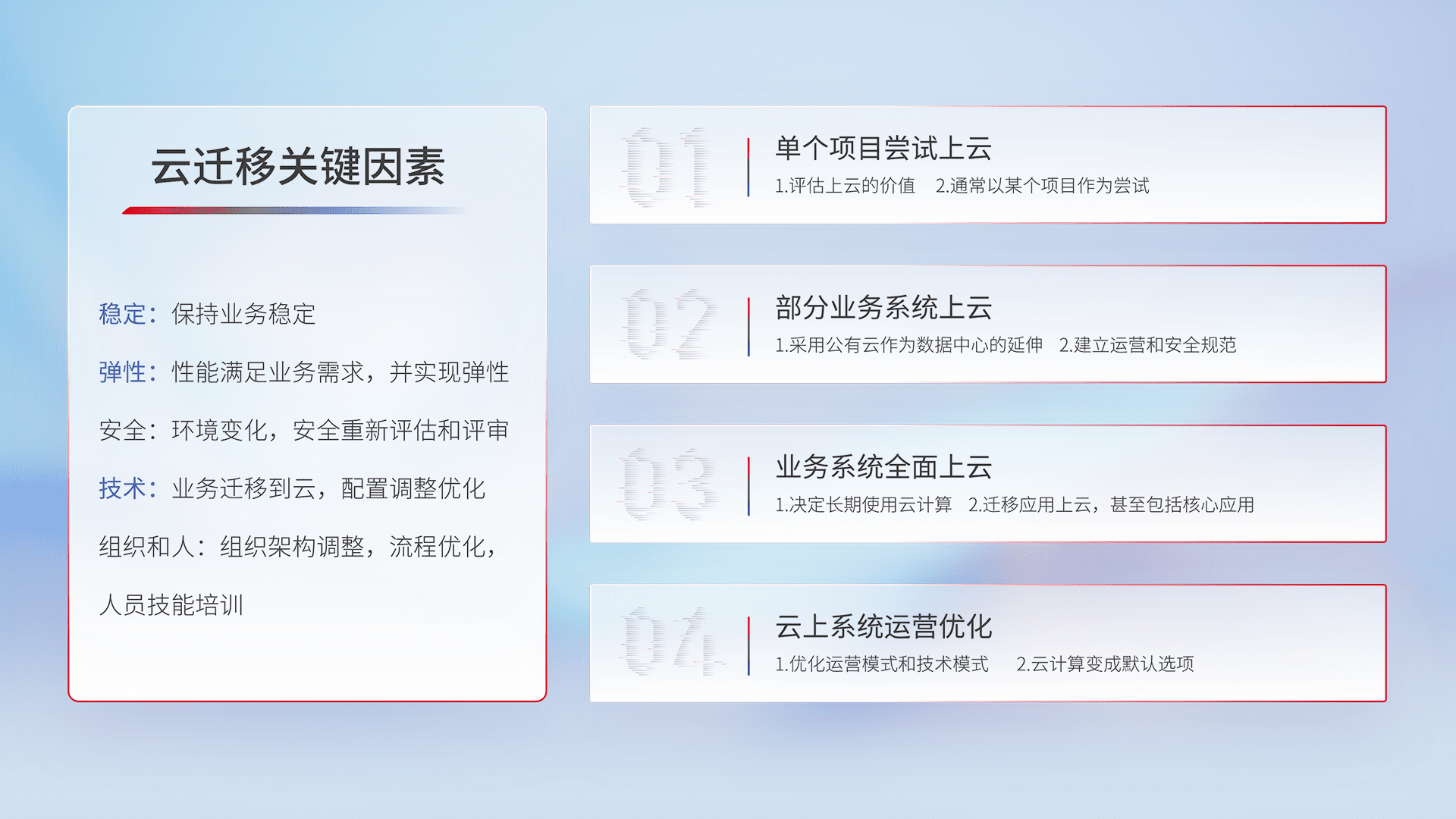 结合实际业务,,从规划设计、、、、云平台选型、、云原生改造、、数据迁移、、集成交付,,迁移全过程为客户识别最佳上云路径,,,,做好风险识别管理,,设计网络架构、、身份权限、、安全审计合规、、、操作审计、、、、日志审计、、监控告警策略、、多站点容灾设计等,,对云上基础设施进行整体规划,,,,提升IT治理水平,,,,以满足弹性、、高可用、、、高性能的需求。。。