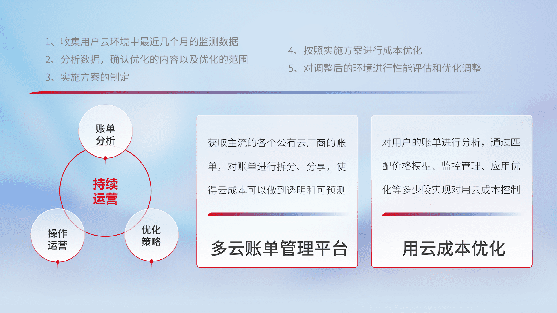 通过多云纳管,,以统一的资源数据模型把客户的云资源进行抽象和封装,,进而实现对多云资源的统一操作,,保障云资源管理的可靠性、、、、稳定性与可用性。。。量身定制化运维内容,,,,配置、、开发运维、、、补丁管理、、、备份、、、监控、、认证和访问管理、、审计和日常巡检等,,,,保障在用云过程中的可靠度,,,稳定度以及高可用率。。