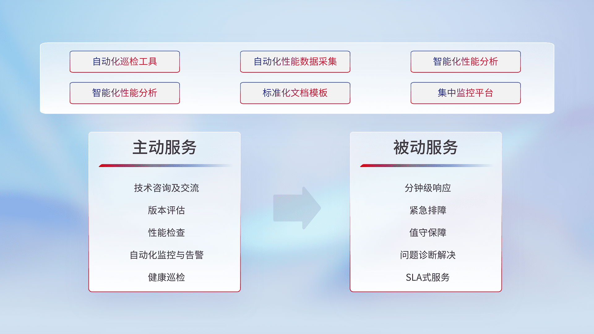 智能化工具和标准化文档,,,保障服务质量,,,提供主动服务(包含技术咨询、、、、版本评估、、性能检查、、、、自动化监控与告警、、健康巡检)和被动服务包含(分钟级响应、、、、紧急排障、、、、值守保障、、、问题诊断解决、、SLA服务)。。。