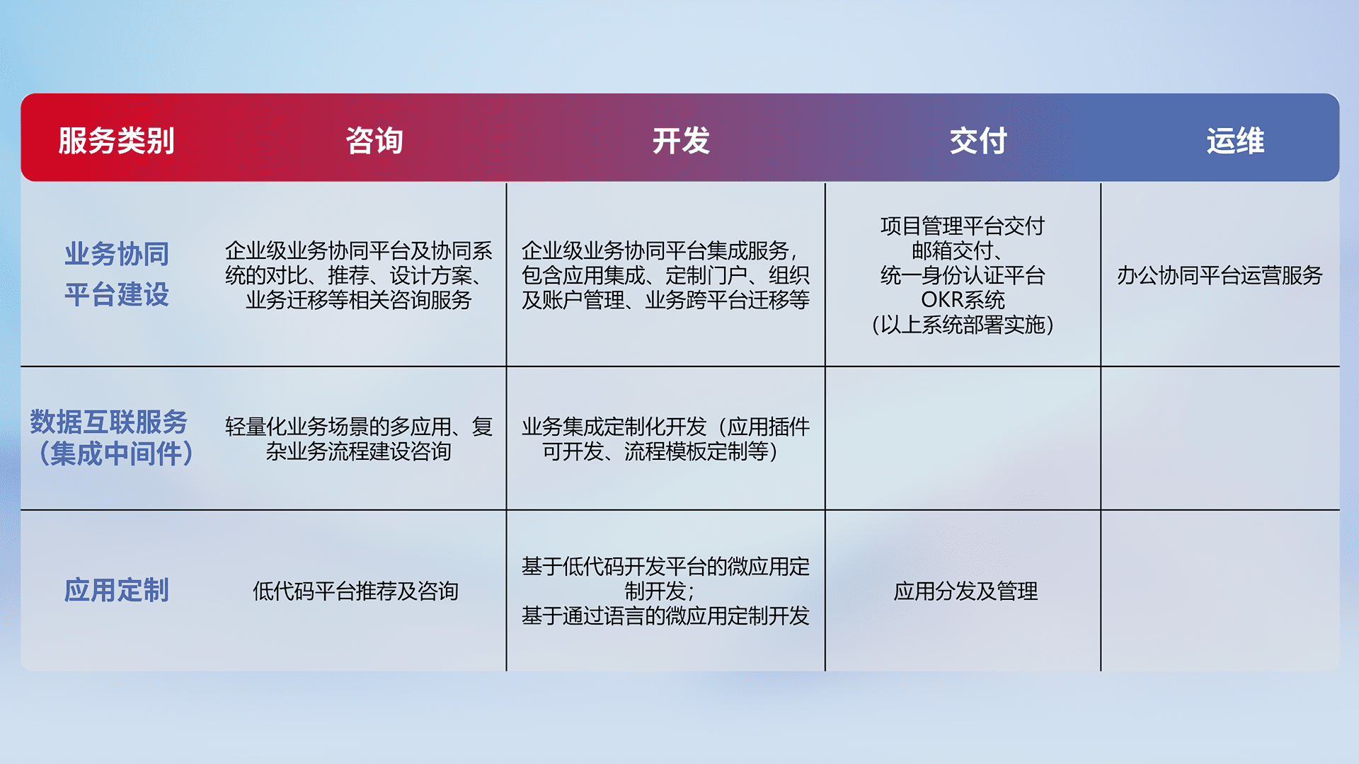 针对钉钉、、企微、、IDaas等平台级产品提供产品的规划、、方案、、、、交付、、、、定制化开发等服务,,,实现如统一协同办公、、、智能客户服务、、、混合会议管理、、、智能数据查询、、、等业务场景,,,,实现数字化转型。。